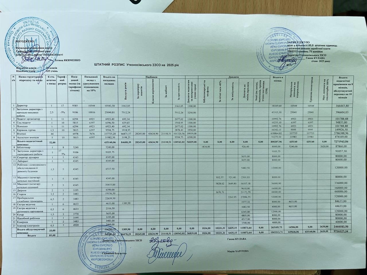 Штатний розпис Утконосівського ЗЗСО на 2025 рік