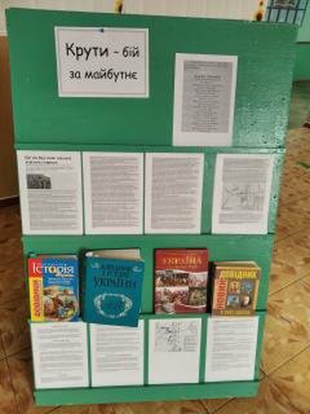 29 січня в Україні відзначають пам'ять героїв Крут - українських студентів, які ціною власного життя зупинили більшовицький наступ на Київ у 1918 році. Завдяки звитязі та сміливості українських воїнів ворожий наступ більшовиків на Київ було зупинено на декілька днів. У цей час відбувалися переговори між Українською Народною Республікою і країнами Четверного союзу. 9 лютого 1918 року Брестський мирний договір було підписано. Він означав визнання самостійної Української Народної Республіки суб’єктом міжнародних відносин. Бібліотека закладу в цей день надала можливість ознайомитися з книжковою виставкою, а також читачі бібліотеки взяли участь у читацькому марафоні та виділили основні моменти, які треба знати про бій під Крутами.
