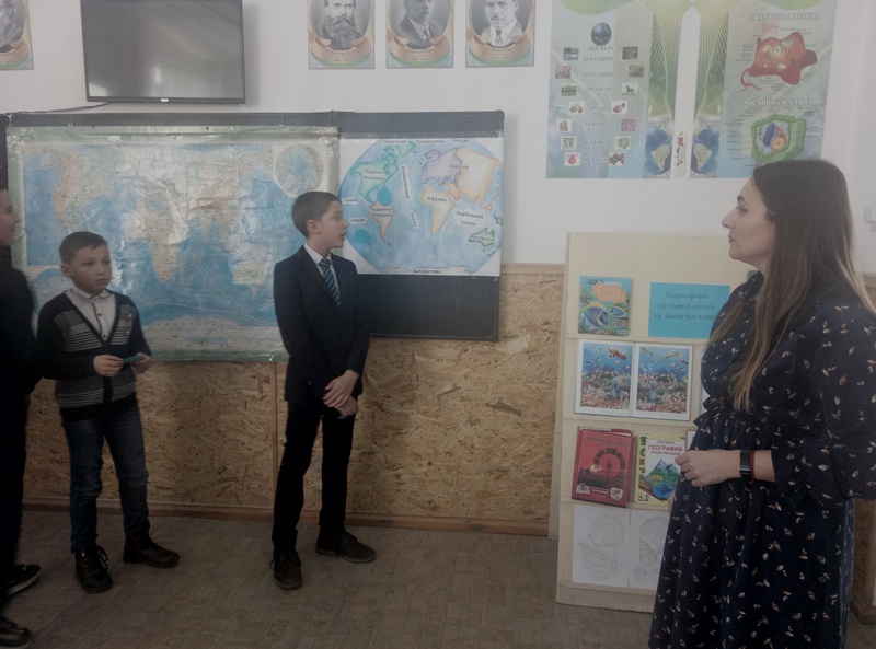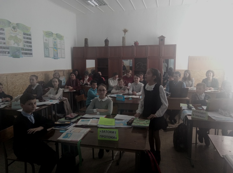 Відкритий урок з географії провела вчитель Кулава Маріанна Петрівна у 6Б класі на тему: «Гідросфера. Світовий океан та його частини. Практична робота №6 «Позначення  на контурній  карті назв океанів, морів, проток, заток, островів, півостровів».